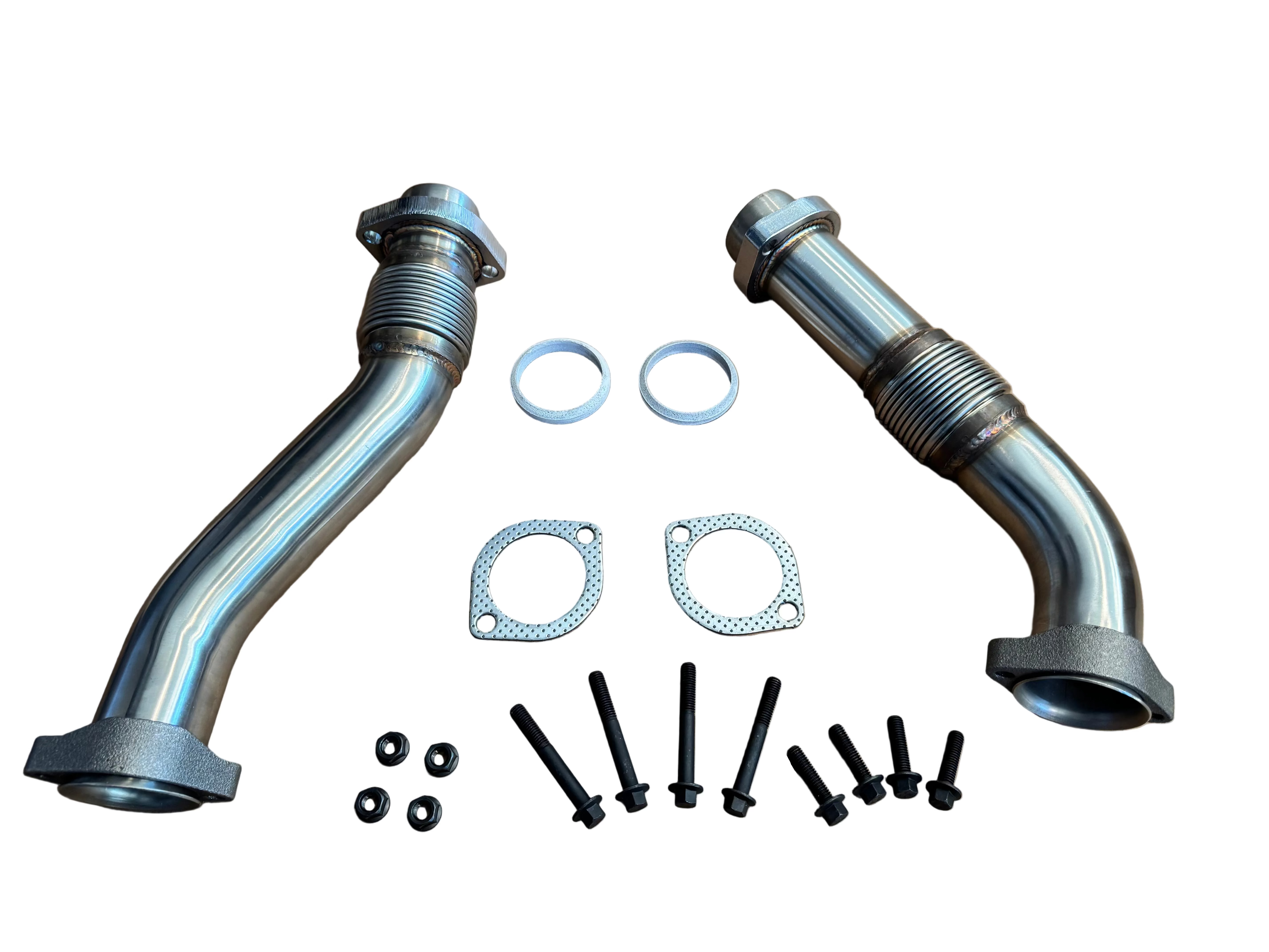 Complete with up pipes, gaskets, bolts, and hardware included. Note: Not compatible with OBS or 99.5 to 2003.