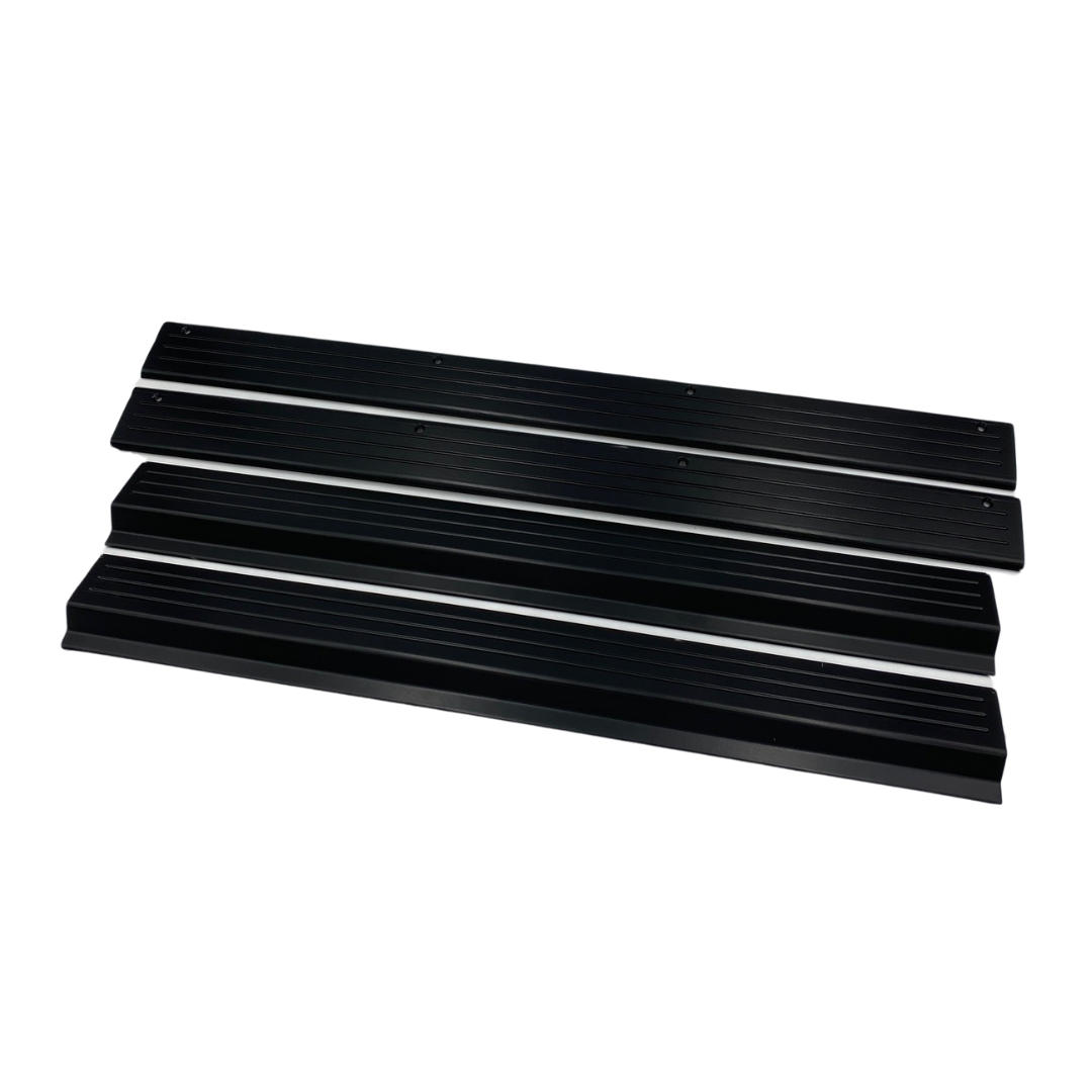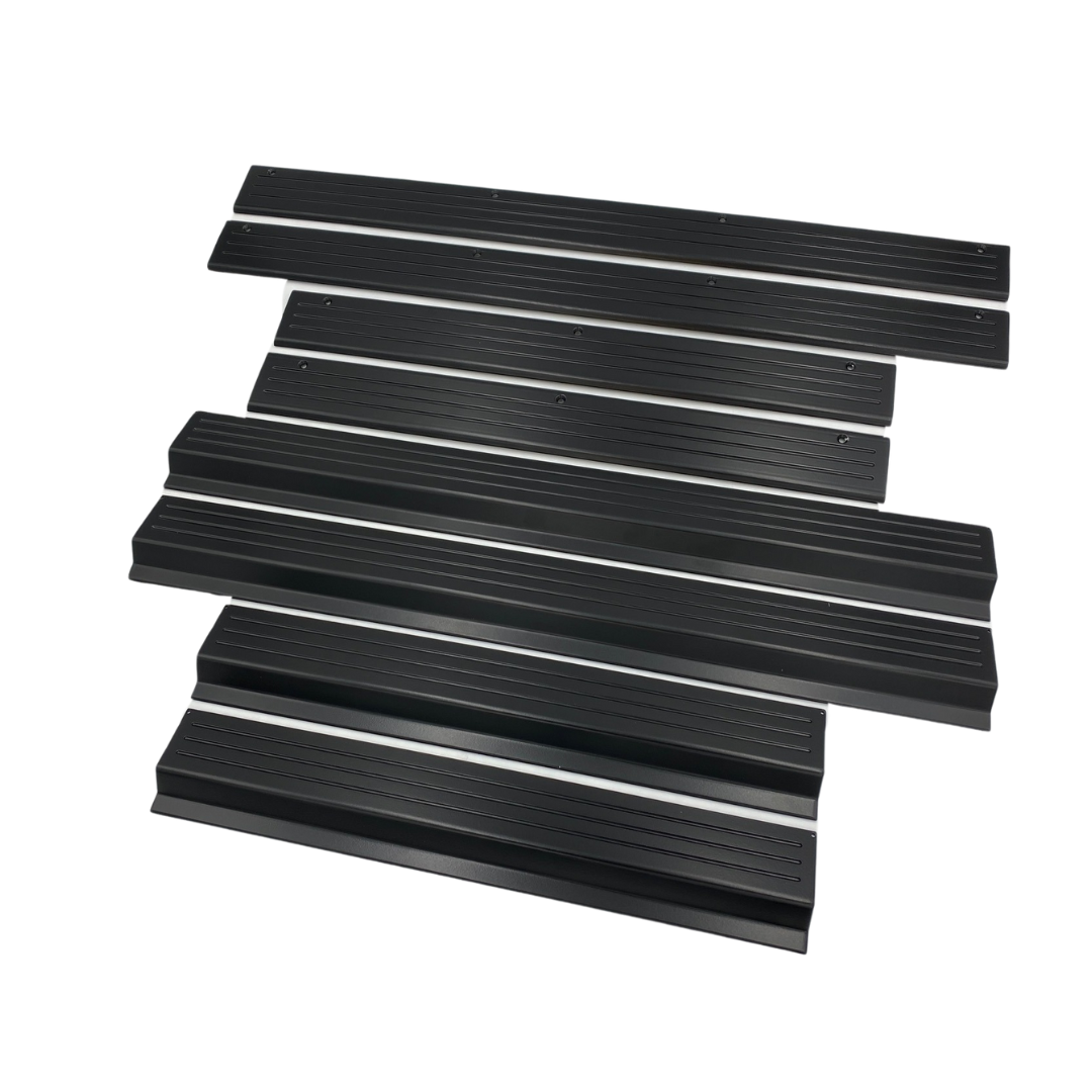 This is a complete set of our Sill and Scuff plate kits. Sill Plate: An aluminum replacement piece for your factory plastic scuff plates. '87-'97 F-Series Trucks and Broncos. Comes with stainless steel screws and instructions. Scuff Plate: One piece aluminum with machined surface to help guard the rocker area from paint wear and scratches. We use an automotive grade adhesive so there is no drilling through your rocker panel. Can be removed with a heat gun. '87-'97 F-Series Trucks. For more information please check us out on Instagram @obs.solutions and Facebook @obssolutions